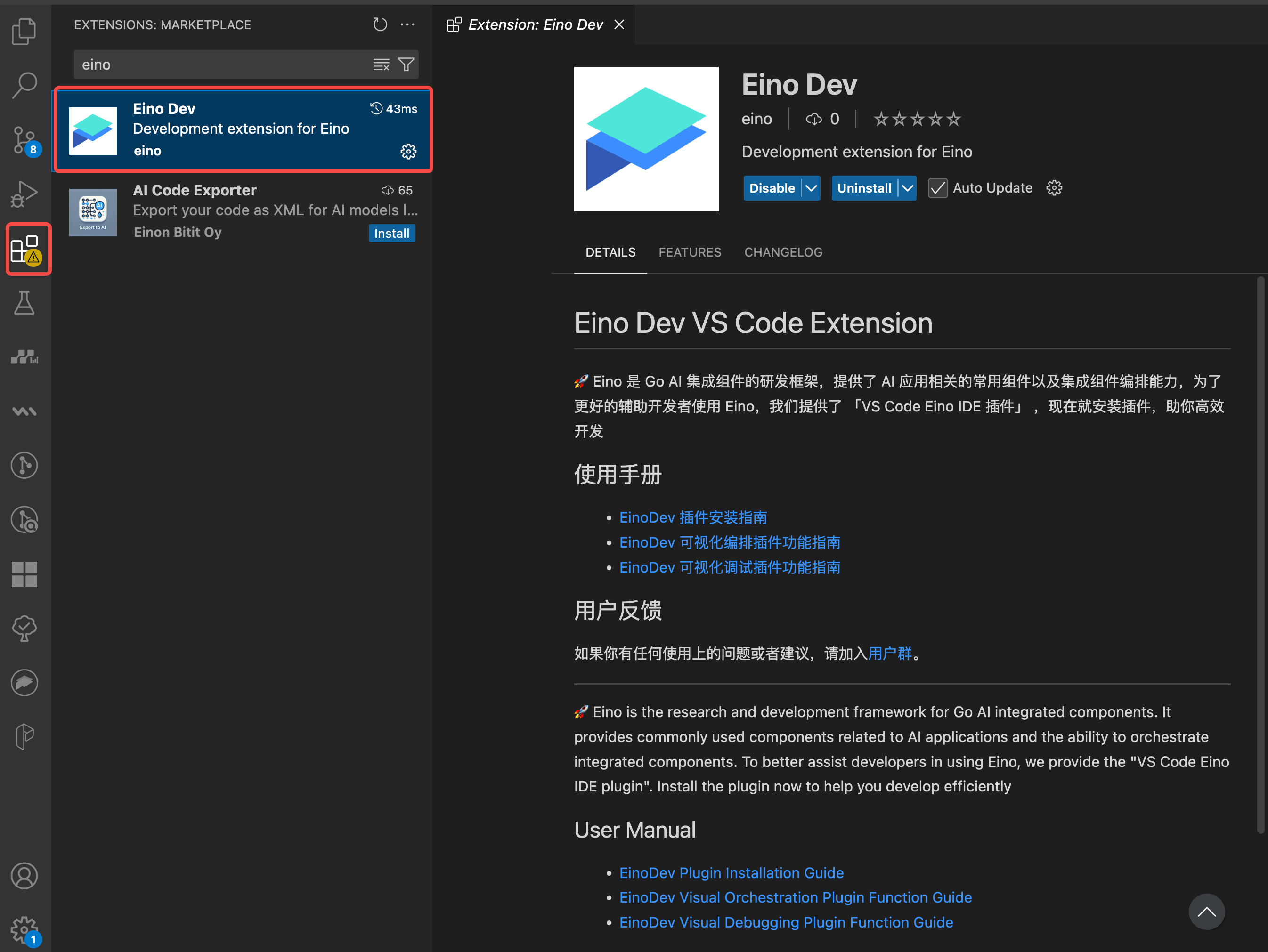 - 在 VS Code 中点击「Extension 图标」,进入插件市场,搜索 Eino Dev,安装即可