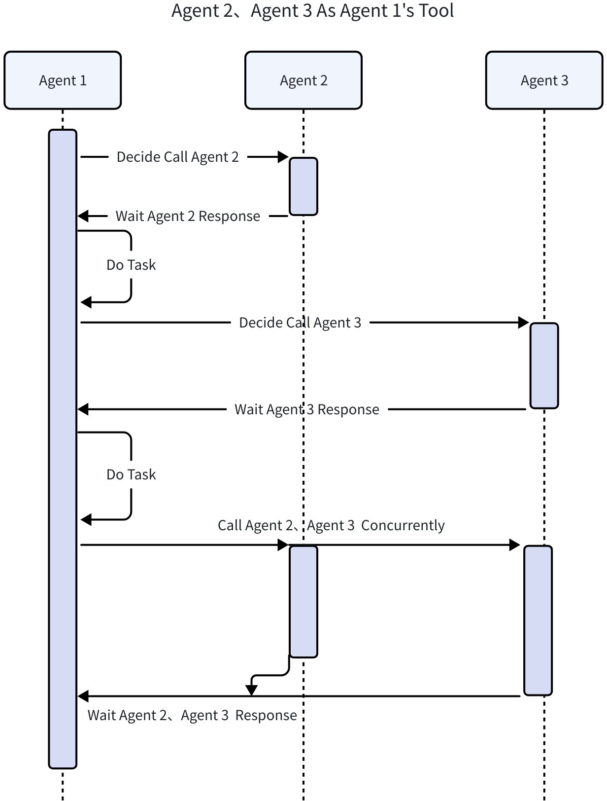 下图展示了 Agent1 把 Agent2、Agent3 当成 Tool 进行调用的过程,类似 Function Stack Call,即在 Agent1 运行过程中,将 Agent2、Agent3 当成工具函数来进行调用。